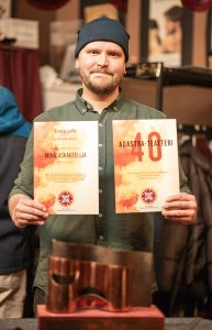 palkinnon näytelmällä Minä, askartelija. Ohjaus Erika Hast. Palkinnon vastaanotti Mikko Hintikka. (Kuvaaja Marianne Hautsalo)