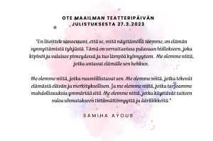 Ystävilleni, teatteritaiteilijoille ympäri maailmaa! Lähetän tämän viestin teille Maailman teatteripäivänä, ja vaikka olen ikionnellinen saadessani puhua teille, minua vavisuttaa ja tunteeni ovat ristiriitaiset epävakaasta maailmantilanteesta…
