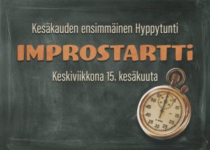 Hyppytunti I: Improstartti – Kaivattuja kohtaamisia Keskiviikko 15.6. kello 17-19.30 Hinta: 15 euroa Ensimmäisellä Hyppytunnilla palataan takaisin toisten äärelle ja improvisaation ytimeen eli vuorovaikutukseen. Impro…
